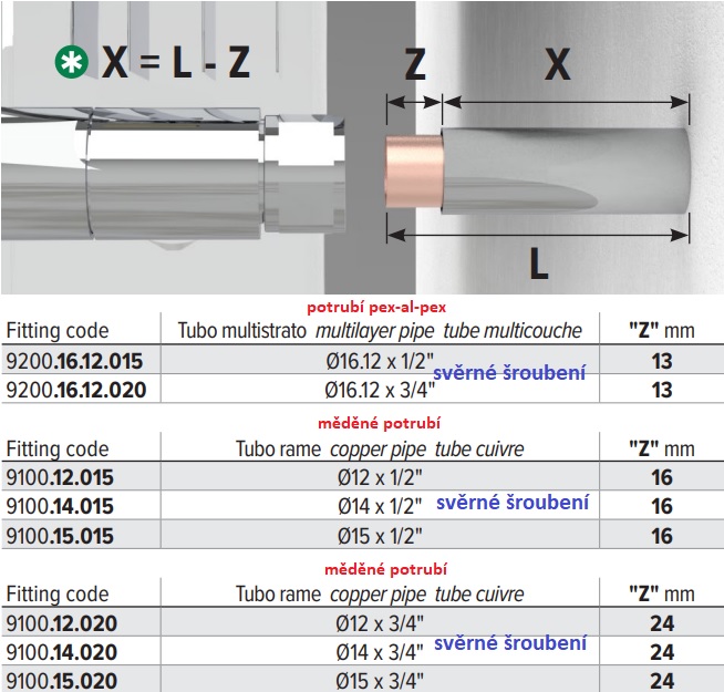 Rozměr Z podle typu potrubí a svěrného šroubení. Délka trubiček L=70 mm, 160 mm.