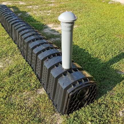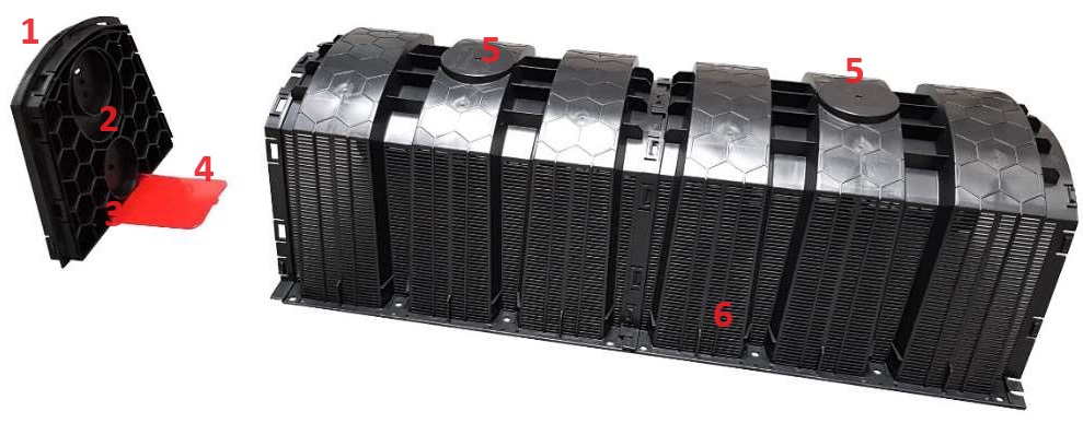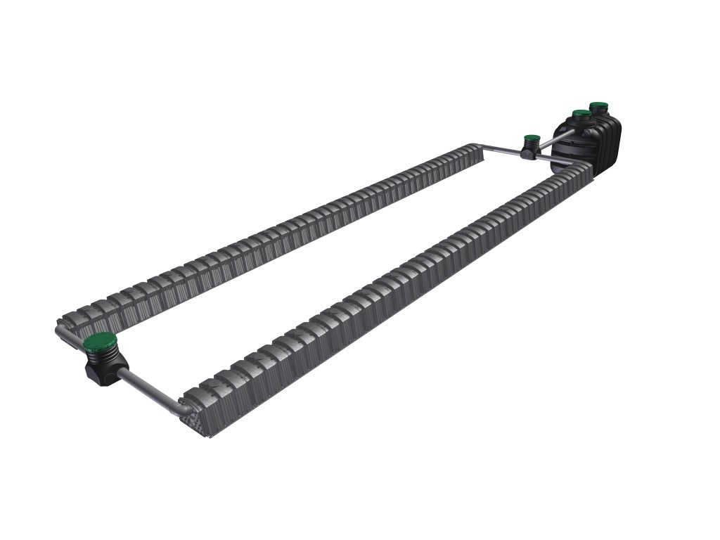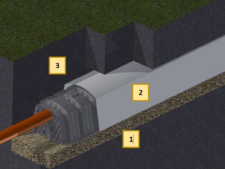 Minimální šířka výkopu lože by měla být 0,5 m a minimální vzdálenost mezi sousedícími řadami tunelů by měla být min. 1 m. Dno výkopu by mělo být pečlivě vyrovnáno. Na dně výkopu by měla být štěrkové podloží podporující vsakování (1) skládající se z kamenů frakce 16-32 mm nebo kameniva (bez vápence) s frakcí 32-64 mm, o tloušťce ne menší než 100 mm. Za předpokladu, že jsou půdy dobře propustné. Nosnou vrstvu lze libovolně zvyšovat v závislosti na půdních a vodních podmínkách. Tunely by měly být pokryty geotextilií (2). Tunelové vedení by mělo být položeno se sklonem asi 1 %. Tunely by měly být položeny v maximální hloubce 1200 mm, od povrchu terénu k horní hraně tunelu. Délka jedné řady tunelů by neměla přesáhnout 30 m. Každá řada tunelů by měla být vybavena přívodem vzduchu - spodní ventilace. Tunelové řady se na konci instalace zasypou nativní zeminou (3). Pro odvod dešťové vody není nutná nosná vrstva.
