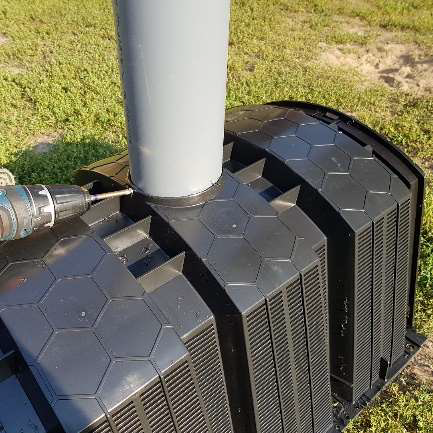 11 do vyvrtaného otvoru instalujte větrací komínek (inspekční otvor) a pomocí nerezových vrutů jej přichyťte k tunelu