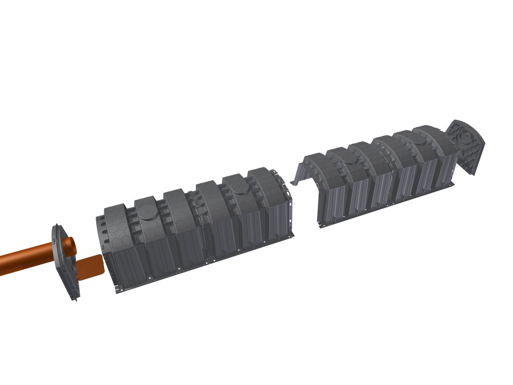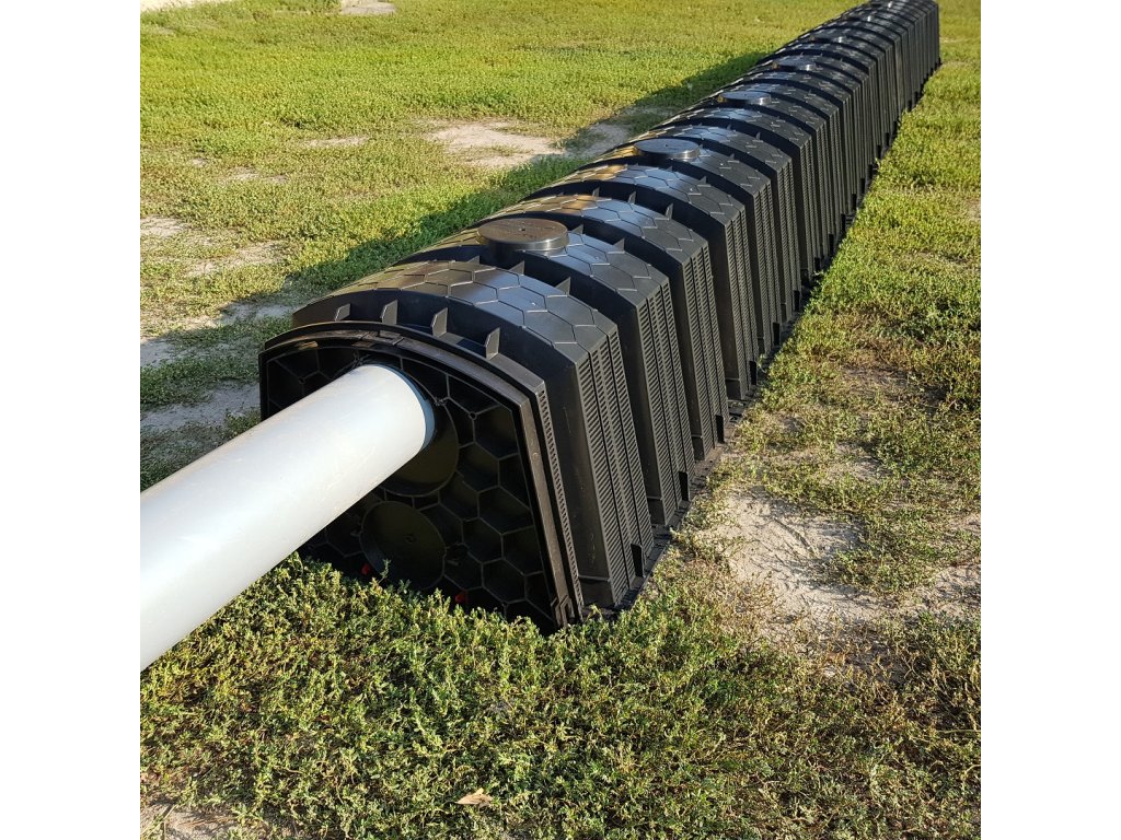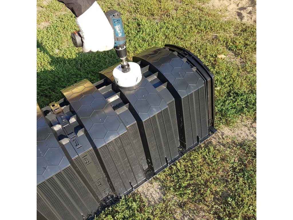 Minimální šířka výkopu lože by měla být 0,5 m a minimální vzdálenost mezi sousedícími řadami tunelů by měla být min. 1 m. Dno výkopu by mělo být pečlivě vyrovnáno. Na dně výkopu by měla být štěrkové podloží podporující vsakování (1) skládající se z kamenů frakce 16-32 mm nebo kameniva (bez vápence) s frakcí 32-64 mm, o tloušťce ne menší než 100 mm. Za předpokladu, že jsou půdy dobře propustné. Nosnou vrstvu lze libovolně zvyšovat v závislosti na půdních a vodních podmínkách. Tunely by měly být pokryty geotextilií (2). Tunelové vedení by mělo být položeno se sklonem asi 1 %. Tunely by měly být položeny v maximální hloubce 1200 mm, od povrchu terénu k horní hraně tunelu. Délka jedné řady tunelů by neměla přesáhnout 30 m. Každá řada tunelů by měla být vybavena přívodem vzduchu - spodní ventilace. Tunelové řady se na konci instalace zasypou nativní zeminou (3). Pro odvod dešťové vody není nutná nosná vrstva.