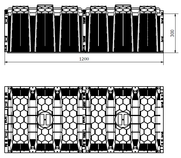 Minimální šířka výkopu lože by měla být 0,5 m a minimální vzdálenost mezi sousedícími řadami tunelů by měla být min. 1 m. Dno výkopu by mělo být pečlivě vyrovnáno. Na dně výkopu by měla být štěrkové podloží podporující vsakování (1) skládající se z kamenů frakce 16-32 mm nebo kameniva (bez vápence) s frakcí 32-64 mm, o tloušťce ne menší než 100 mm. Za předpokladu, že jsou půdy dobře propustné. Nosnou vrstvu lze libovolně zvyšovat v závislosti na půdních a vodních podmínkách. Tunely by měly být pokryty geotextilií (2). Tunelové vedení by mělo být položeno se sklonem asi 1 %. Tunely by měly být položeny v maximální hloubce 1200 mm, od povrchu terénu k horní hraně tunelu. Délka jedné řady tunelů by neměla přesáhnout 30 m. Každá řada tunelů by měla být vybavena přívodem vzduchu - spodní ventilace. Tunelové řady se na konci instalace zasypou nativní zeminou (3). Pro odvod dešťové vody není nutná nosná vrstva.