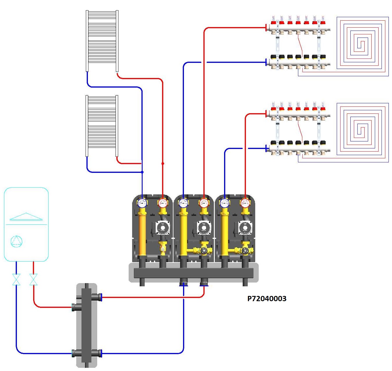 - jako hydraulický separátor s izolací pro podlahové/sálavé vytápění a vysokoteplotní systémy