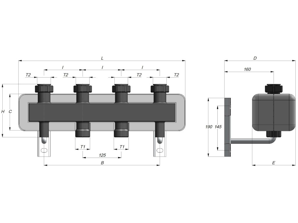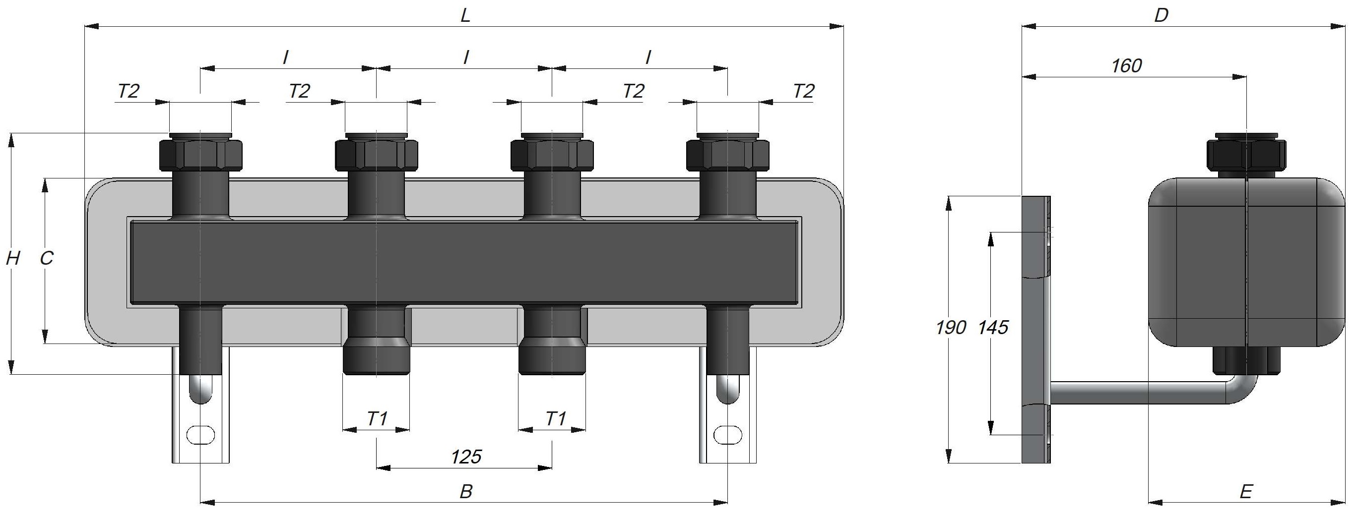 - jako duální rozdělovač 6/4" s izolací pro podlahové/sálavé vytápění a vysokoteplotní systémy