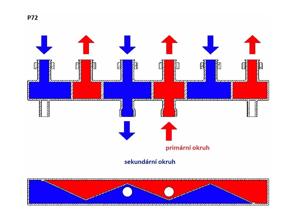 - Duální rozdělovač umožňuje distribuci topné vody přicházející ze zdroje (hlavního okruhu) do systému. Topný a vratný okruh instalace (červený primární a modrý sekundární okruh) jsou rozděleny v rozdělovači svislou stěnou sinusového tvaru.