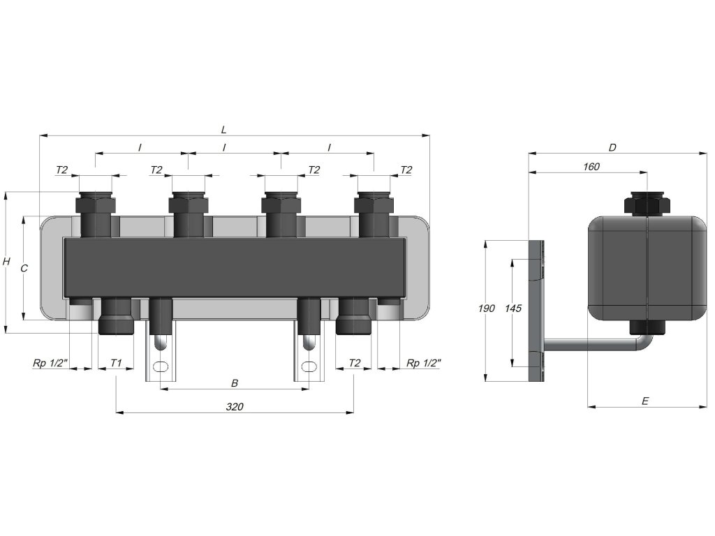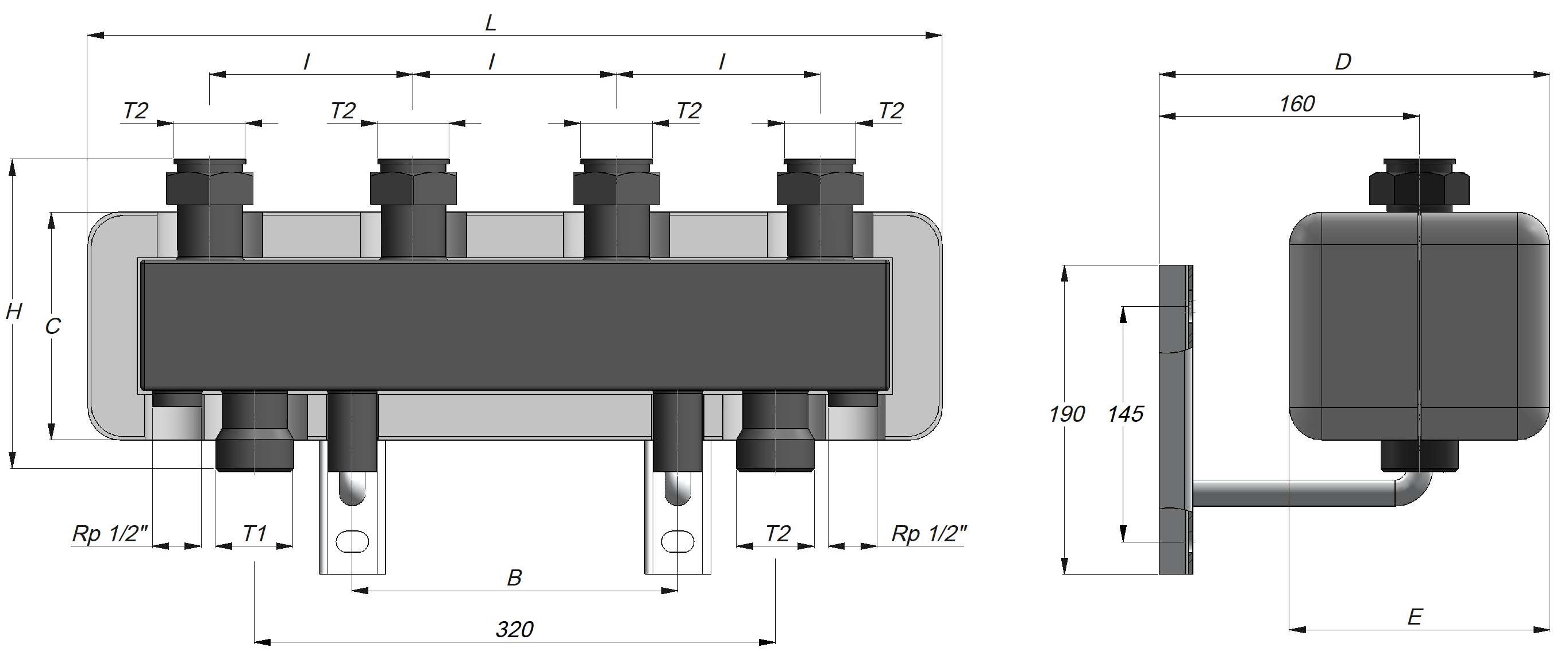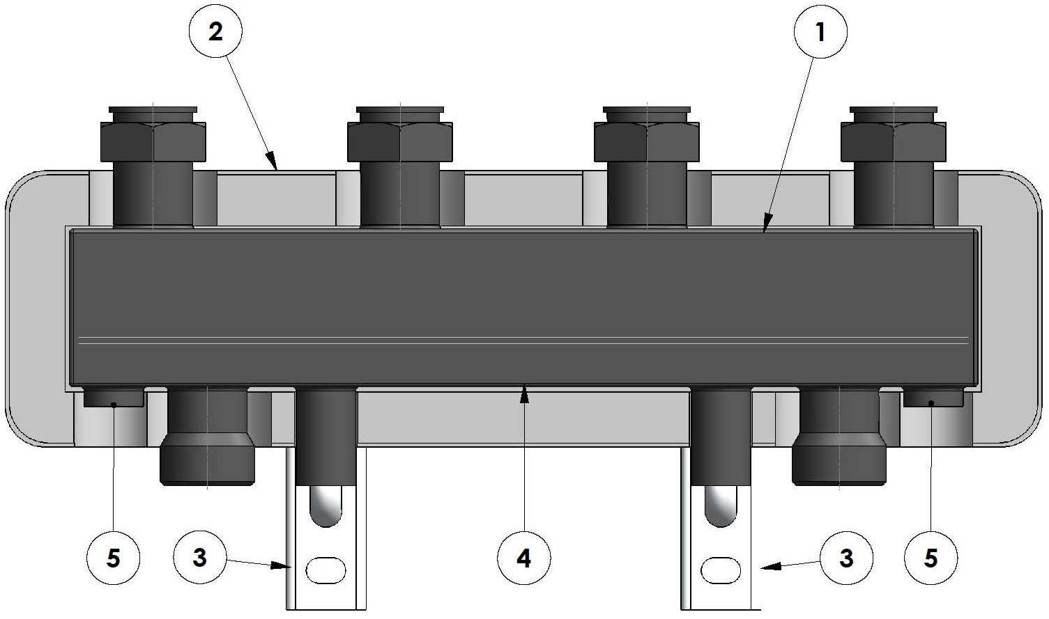 BARBERI P74 rozdělovač s integrovaným hydraulickým separátorem a izolací pro připojení na čerpadlovou skupinu 6/4" + nástěnné držáky