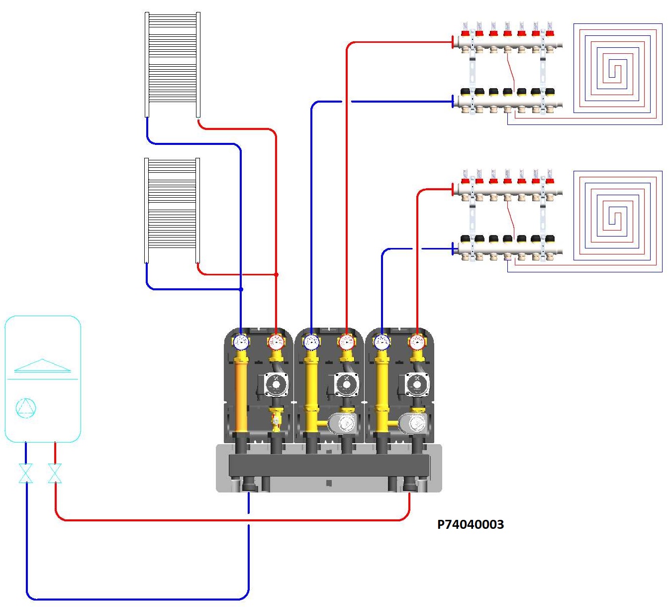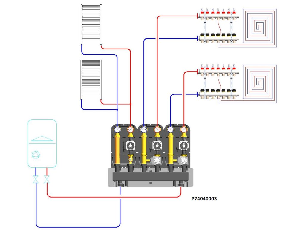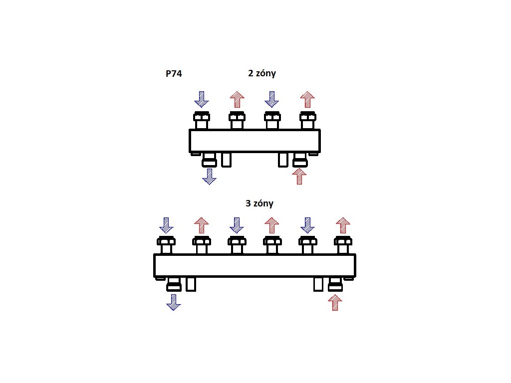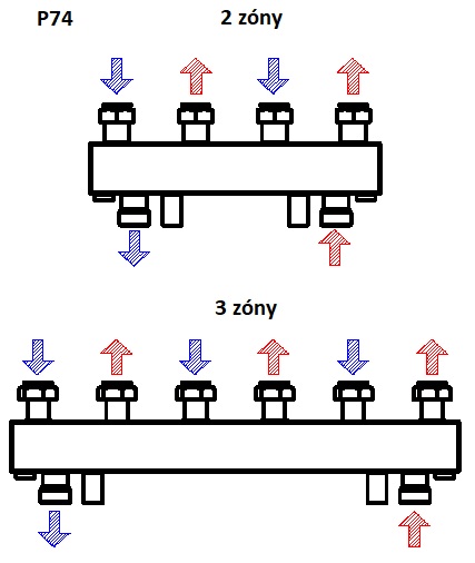 - Rozdělovač P74 s integrovaným hydraulickým separátorem kombinuje výhody rozdělovače P72 samostatně napojeného přímo na hydraulický separátor