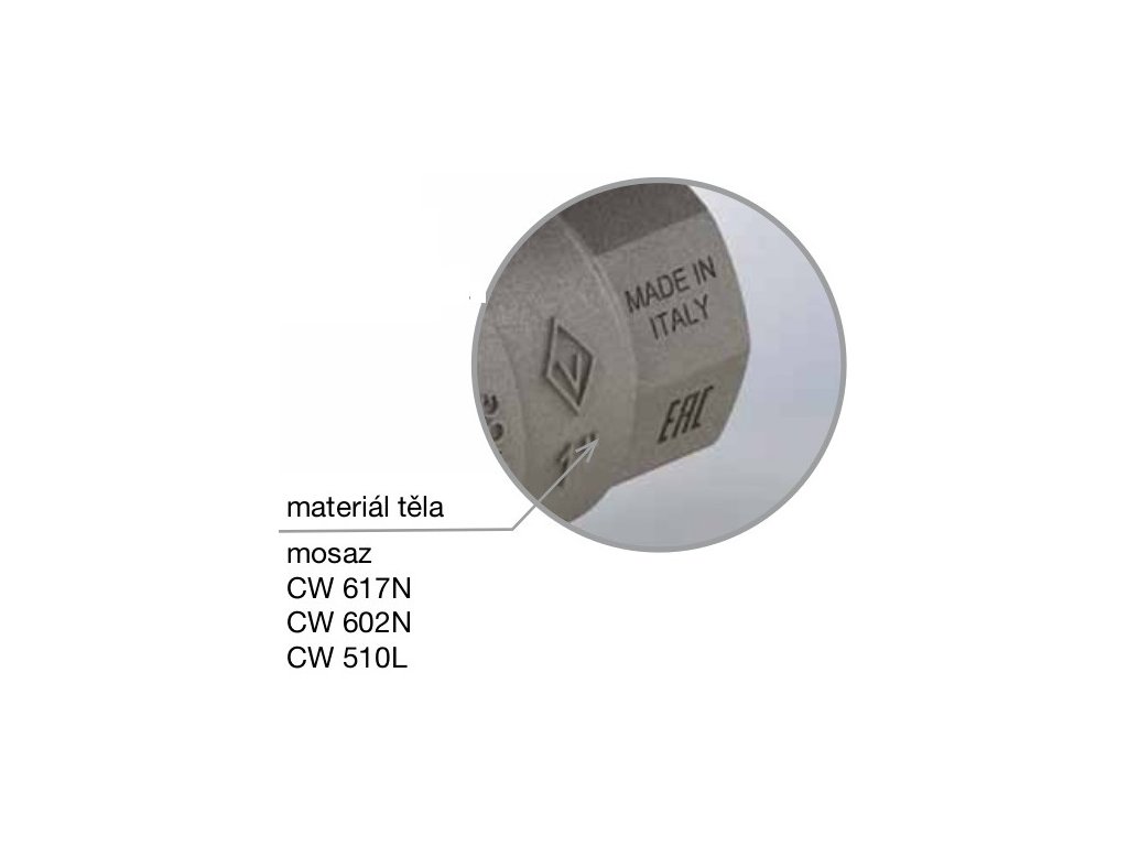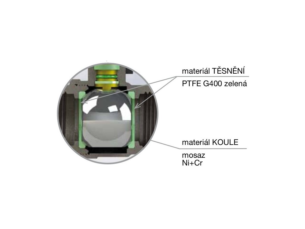 1 tělo CW617N Ni, 2 koncové připojení CW617N Ni, 3 těsnění koule PTFE G400 Green, 4 koule CW617N Ni+Cr, dřík CW614N, 6 spodní těsnění PTFE G400, 7 o-kroužek 01/T70 FKM VITON, 8 horní těsnění PTFE G400 Green, 9 matice ocel Zn, 10 mosazný kroužek CW614N, 11 ručka ocel s potiskem