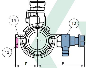 1 tělo CW617N Ni, 2 koncové připojení CW617N Ni, 3 těsnění koule PTFE G400 Green, 4 koule CW617N Ni+Cr, dřík CW614N, 6 spodní těsnění PTFE G400, 7 o-kroužek 01/T70 FKM VITON, 8 horní těsnění PTFE G400 Green, 9 matice ocel Zn, 10 mosazný kroužek CW614N, 11 ručka ocel s potiskem, 12 vypouštěcí kohout CW614N+POM, 13 zátka CW614N, 14 o-kroužek 01/T70 FKM VITON