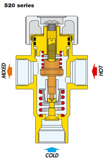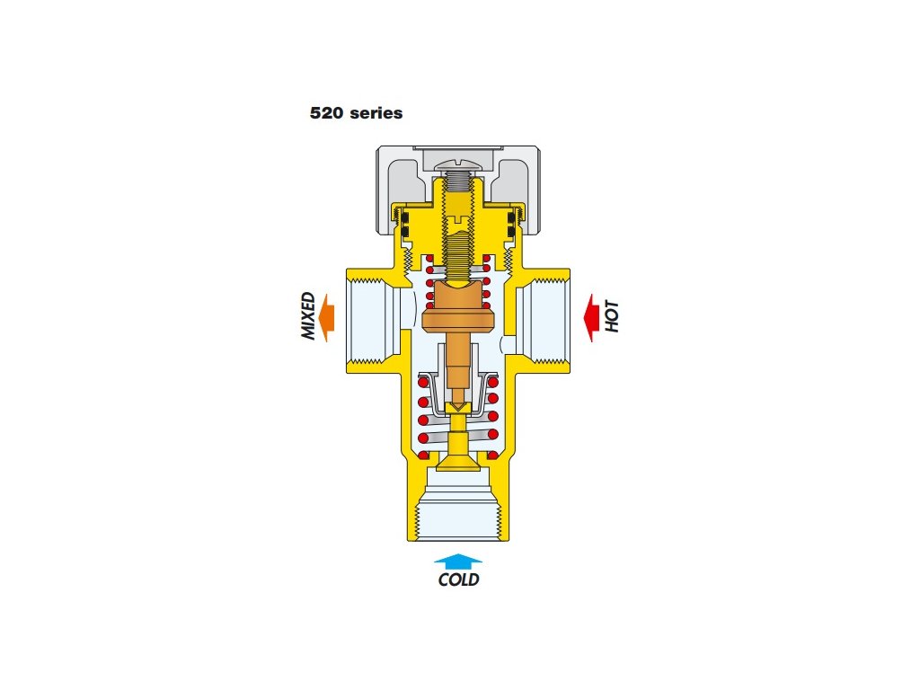 Směšovací ventily řady 520 se nesmí používat v systémech s průtokovým ohřevem vody z důvodu možného kolísání tlaku (průtoku).