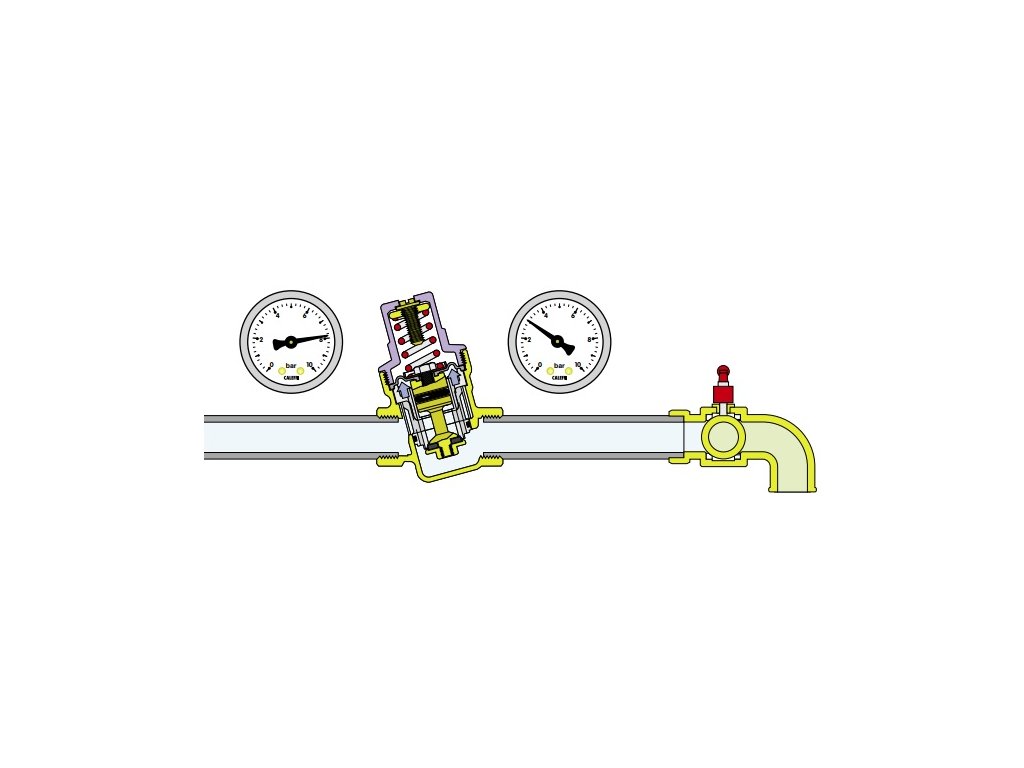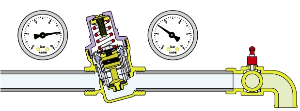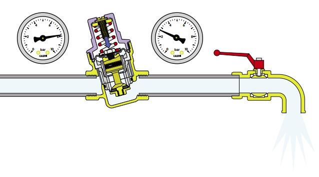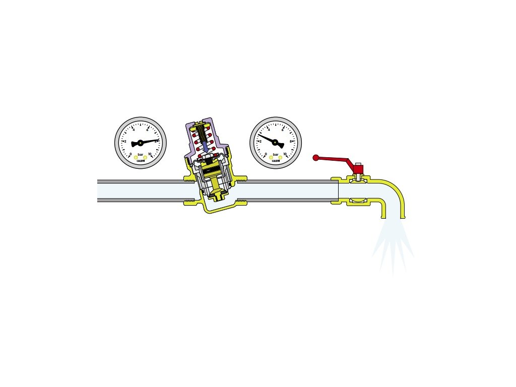 Když se v systému otevře výtoková armatura, síla pružiny v regulátoru bude větší než síla membrány; sedlo se pohybuje dolů a otevírá ventil proudu vody. Čím větší je potřeba vody, tím nižší je tlak pod membránou a tím větší průtok vody ventilem.