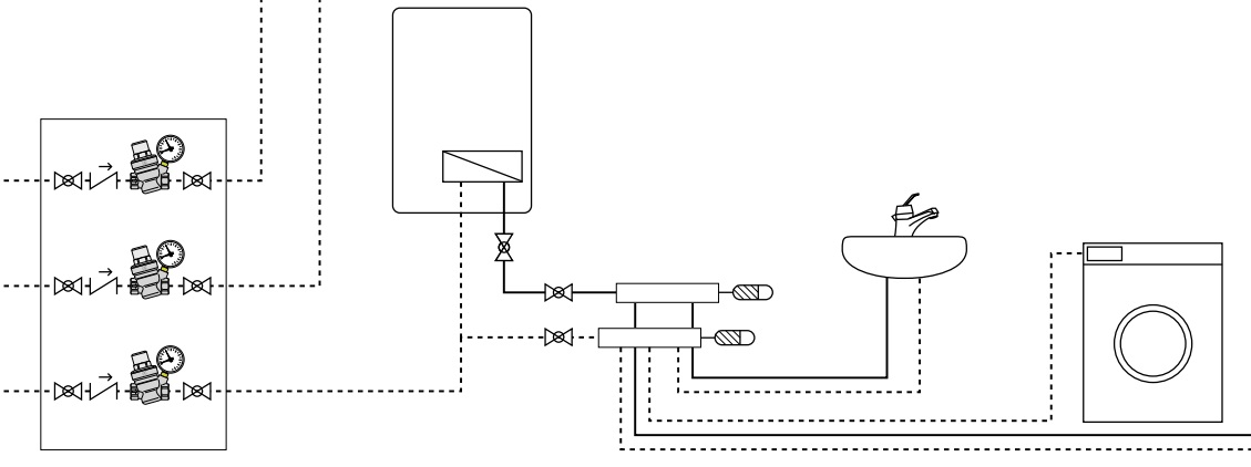 V budovách s více podlažími je vhodné, aby byl redukční ventil instalován v každém podlaží, spíše než jeden ve spodní části budovy. Pamatujte, že kapalina ztrácí tlak 1 bar přibližně každých 10 výškových metrů.
