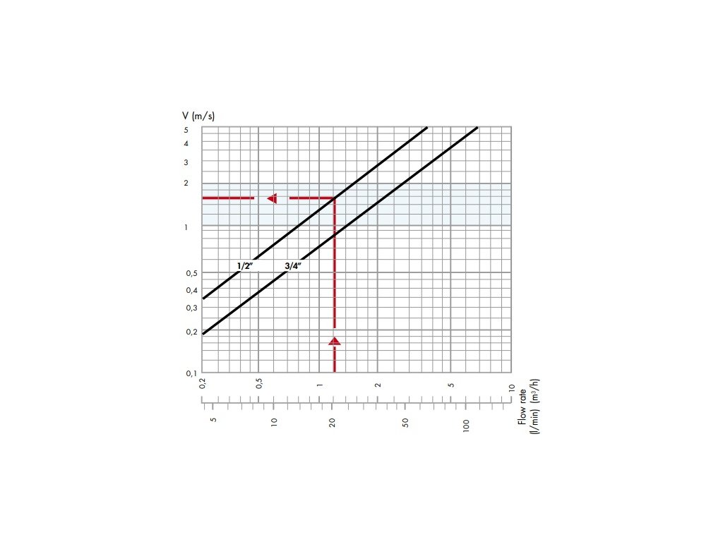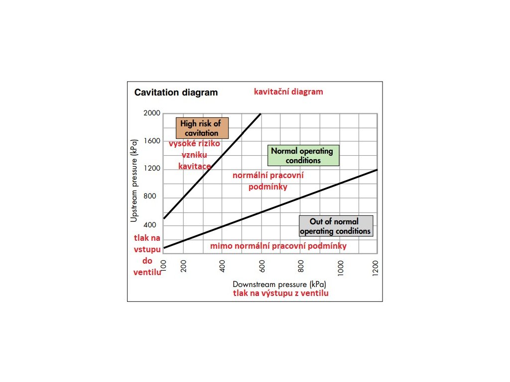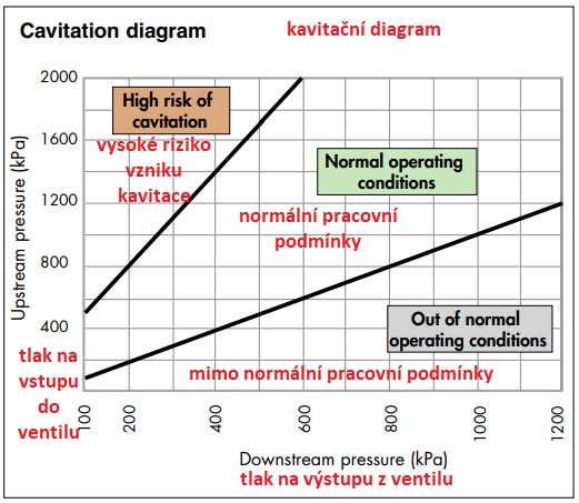 Abyste minimalizovali riziko vzniku kavitace v redukčním ventilu, která by mohla způsobit korozi v oblasti těsnění, vibrací a hluk, výrobce důrazně doporučuje dodržovat provozní podmínky uvedené v diagramu. V důsledku mnoha faktorů a proměnných podmínek, jako jsou: tlak v systému, teplota, přítomnost vzduchu, průtok a rychlost, které by mohly ovlivnit výkon redukčního ventilu. Je vhodné udržovat poměr mezi tlakem před a za ventilem ideálně 2:1 a ne více než 3:1 (např. tlak na vstupu 10 bar, tlak za proudem 5 bar, tlakový poměr = 10/5 = 2:1). Za těchto podmínek je riziko vzniku kavitace minimální, ale to nevylučuje možné účinky mnoha dalších faktorů působících v systému během provozu. Pokud tlakový poměr překročí stanovený limit, měli byste zvážit použití jiného redukčního ventilu. Potrubí před a za redukčním ventilem musí být zajištěno konzolami v souladu s pokyny výrobce a místními požadavky, aby se zabránilo generování a přenosu hluku a/nebo vibrací v instalaci.
