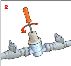 1 Před instalací redukčního ventilu otevřete všechny vodovodní kohoutky (vodovodní baterie atd,), abyste vyčistili systém. Odstraňte (odvzdušněte) veškerý vzduch ze systému