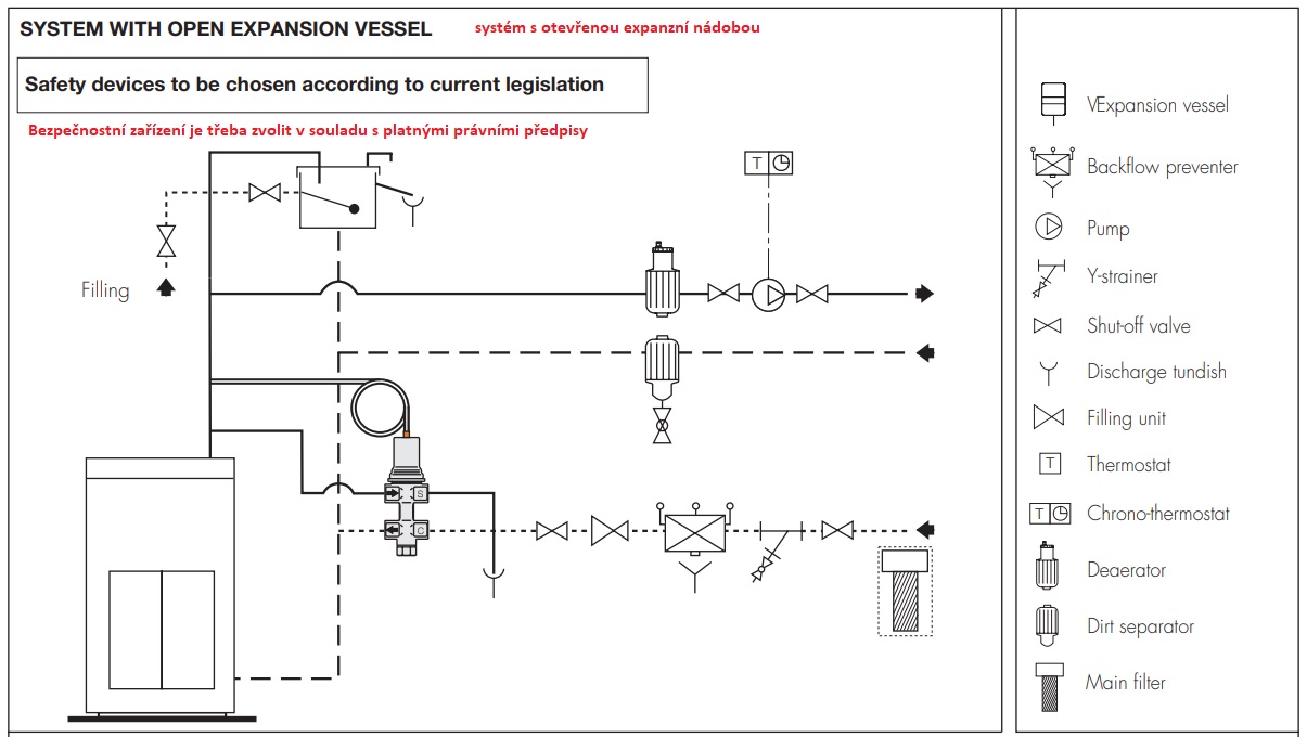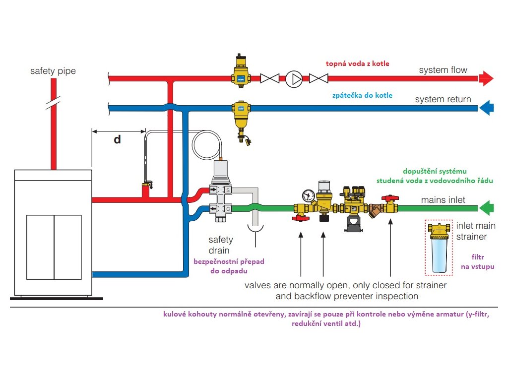 Aby se předešlo jakékoli poruše v důsledku přítomnosti nečistot, doporučuje se nainstalovat na plnicí vstup kontrolovatelné y-filtr nebo jiný filtr s magnetem. Vše je nutné pravidelně kontrolovat, zda je sítko filtru čisté a neucpané. Doporučuje se instalovat sítko v průhledné nádobě, aby bylo možné kontrolovat stav nečistot během provozu.