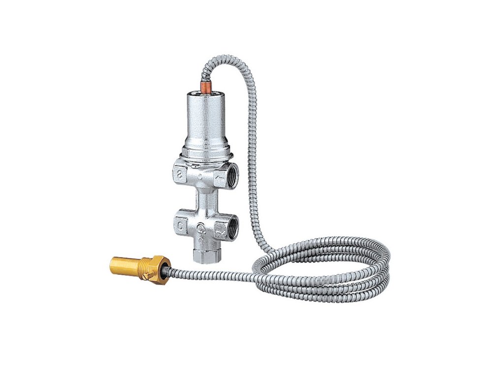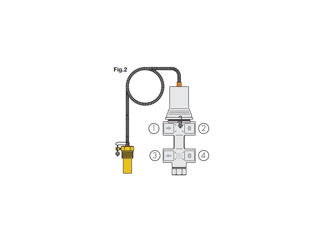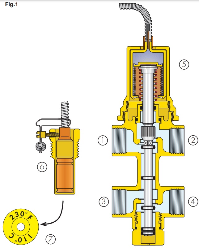 Po dosažení nastavené teploty (obr.1) se otevře vstupní otvor studené vody (4 a 3) a současně se otevře vypouštěcí otvor (1 a 2). To trvá tak dlouho, dokud teplota v systému neklesne pod spouštěcí hodnotu a vstup a výstup se uzavřou současně. V případě poruchy teplotního čidla (5) (6) bude ventil nepřetržitě vykonávat stejnou funkci vypouštění a napouštění. Termometrický štítek (7) na teplotním čidle ukazuje, zda byla překročena maximální přípustná teplota 110 °C.