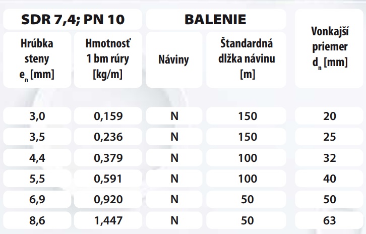 - pro rozvody pitné a užitkové vody s provozním tlakem do 1,0 MPa (PN 10) a teplotě 20 °C