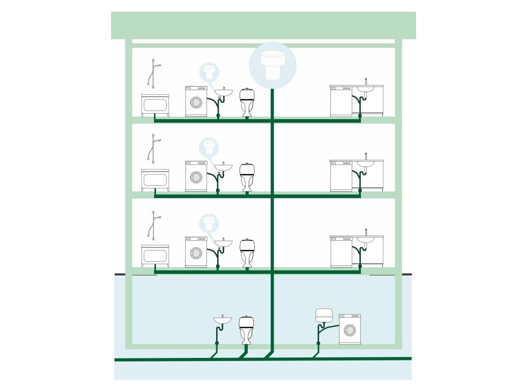 Interiérová přivzdušňovací ventil může být instalovaná na konci vertikálního/páteřního rozvodu odpadního potrubí a/nebo v řezu na horizontálních odbočkách.