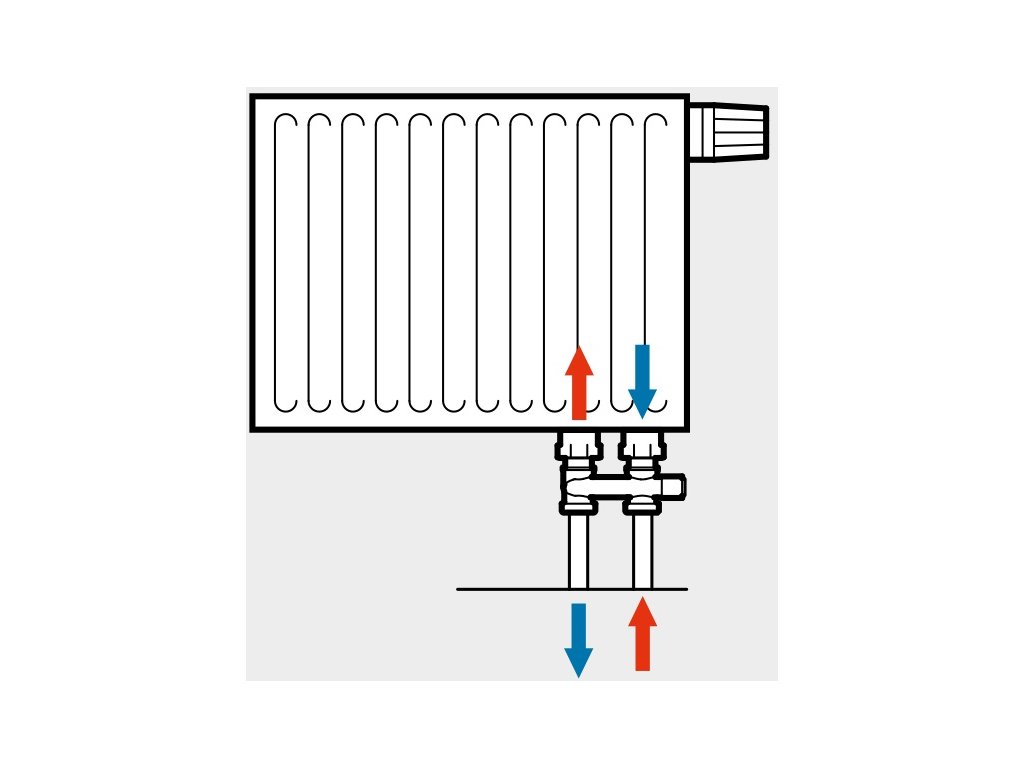 - pro správné dopojení topné a vratné vody k deskovému radiátoru se spodním připojením v případě záměny přívodu a zpátečky
