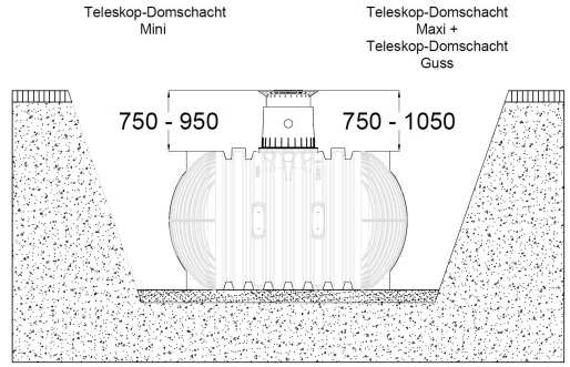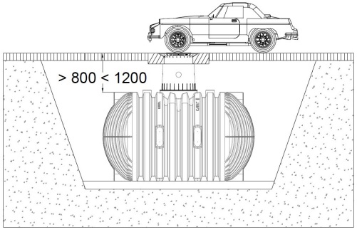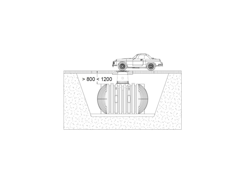 Je-li nádrž instalována pod pojezdovými plochami, musí být teleskopický nástavec 1 (barva antracit) v oblasti límce podbetonována 4 (třída zatížení B25 = 250 kg/m²). Betonová vrstva musí být min. 400 mm široká a max. 200 mm vysoká. Nejmenší překrytí přes rameno nádrže obnáší nejméně 800 mm (max. 1050 mm s teleskopem, se spojovacím kusem je možný překryv do max. 1200 mm).