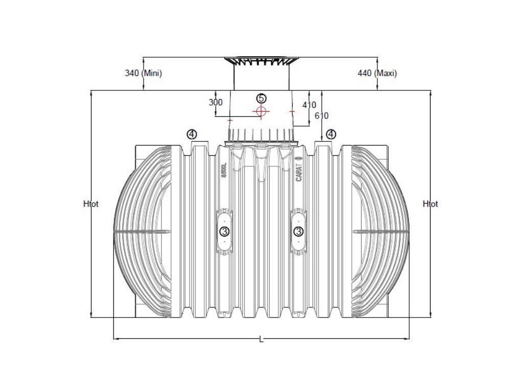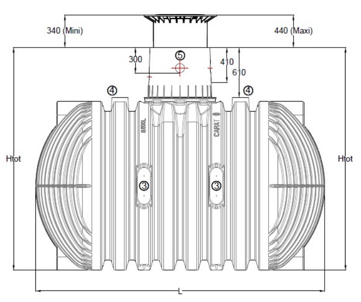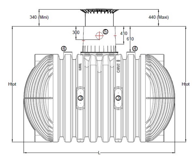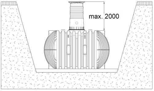 Maximální výška překryvu nádrže s mezikusem a teleskopickým nástavcem (pouze v pochozí oblasti, ne pod pojezdovými plochami osobními vozy). Bez spodní vody.