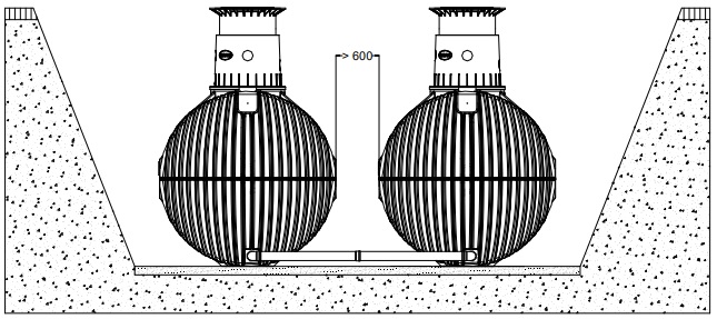 Spojení dvou nebo více nádrží se provádí přes montážní plochy, pomocí speciálních těsnění GRAF (DN 100) a KG trubek (umístit ze strany stavby). Montážní otvory je nutno vyvrtat speciálním dutým vrtákem GRAF odpovídající velikosti. Je třeba dbát na to, aby byl odstup mezi nádržemi min 600 mm. Trubky musí být zapuštěny min. 200 mm do nádrží.