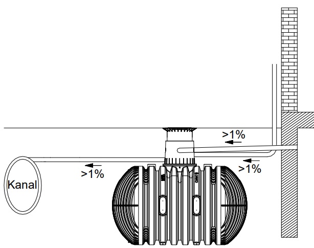 Veškeré přívodní a přepadové potrubí je nutno položit se sklonem min. 1 % ve směru toku do nádrže (přitom je nutno zohlednit možné pozdější poklesy). Bude-li přepad nádrže napojen na veřejnou kanalizaci, musí být zajištěn proti zpětnému vzdutí zpětnou klapou (pouze kanál na dešťovou vodu). Veškerá sací, tlaková a řídící potrubí je třeba vést v prázdné trubce (chránička), která se pokládá se sklonem k nádrži bez průhybů co možná nejrovněji. Požadované oblouky je možno vytvořit 30° tvarovkami.