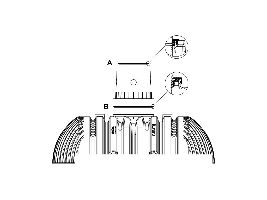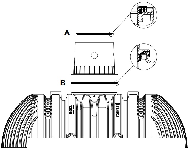 Před vlastní montáží se dodané těsnění vloží mezi nádrž a dóm do těsnící drážky hrdla nádrže „B“, potom se dóm vyrovná s přívodním potrubím a zatlačí do hrdla nádrže až na doraz. Je nutné věnovat pozornost hornímu těsnění „A“ (je již předmontované).
