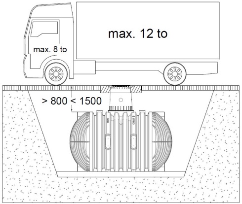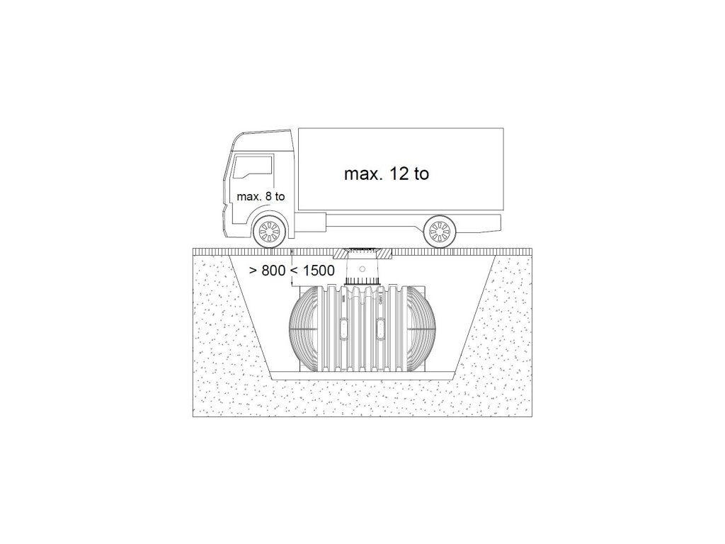 Výška překryvu nádrže teleskopickým nástavcem a litinovým poklopem BEGU (třída B, resp. D) v pojezdové oblasti nákladními vozidly do 12,5 t. Je třeba zhotovit betonovou roznášecí desku. Výpočet musí být proveden statikem! (oblast bez spodní vody).