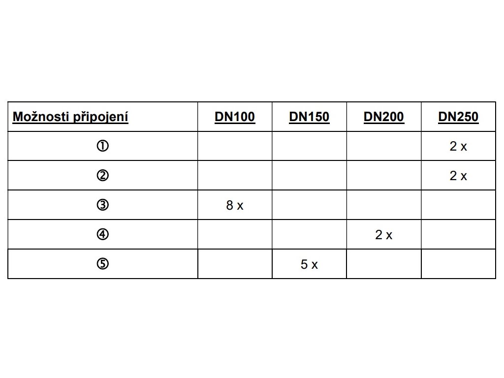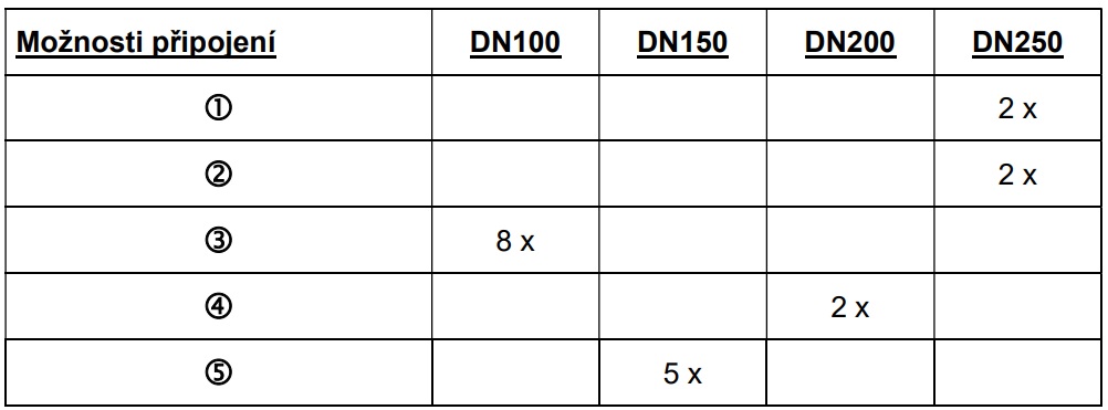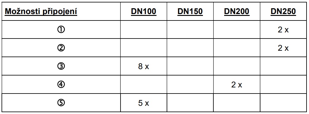 | Připojení: | 5 x DN 100, 5 x DN 150 |
