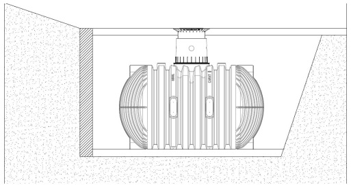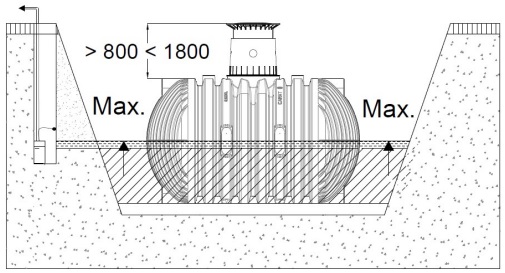 Pro zajištění maximálního pracovního prostoru musí základní plocha stavební jámy přesahovat na každé straně o 500 mm, odstup od pevných staveb musí být nejméně 1000 mm. Svah je nutno založit dle DIN 4124. Pozemek musí být vodorovný, plochý a musí vykazovat dostatečnou nosnost. Hloubka jámy musí být vyměřena tak, aby nebyl překročen maximální překryv nad nádrží (viz bod Podmínky pro instalaci). Pro celoroční používání zařízení je třeba instalovat nádrž a vodovodní části zařízení v nezámrzné hloubce. Nezámrzná hloubka je zpravidla v hloubce cca 600 mm – 800 mm, přesné údaje obdržíte u příslušného úřadu. Jako podklad se pokládá vrstva zhuštěného kulatozrnného štěrku (zrnitost 8/16, tloušťka vrstvy cca 150 – 200 mm).
