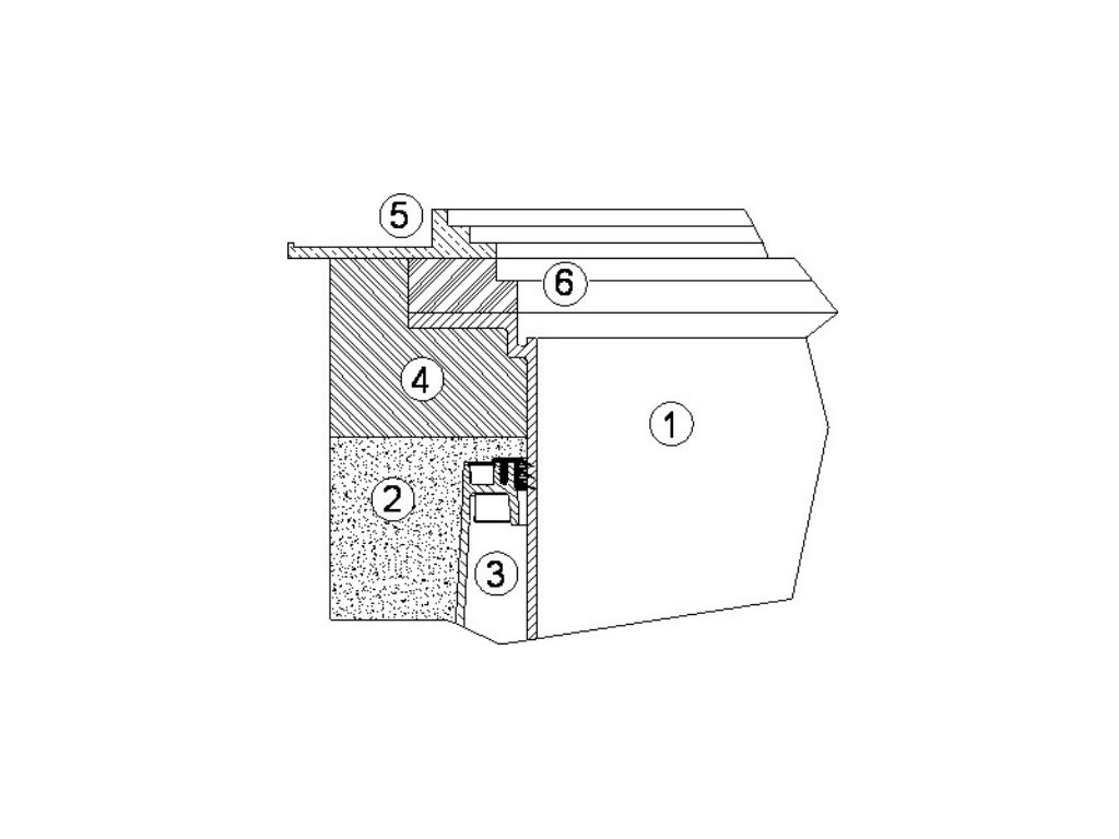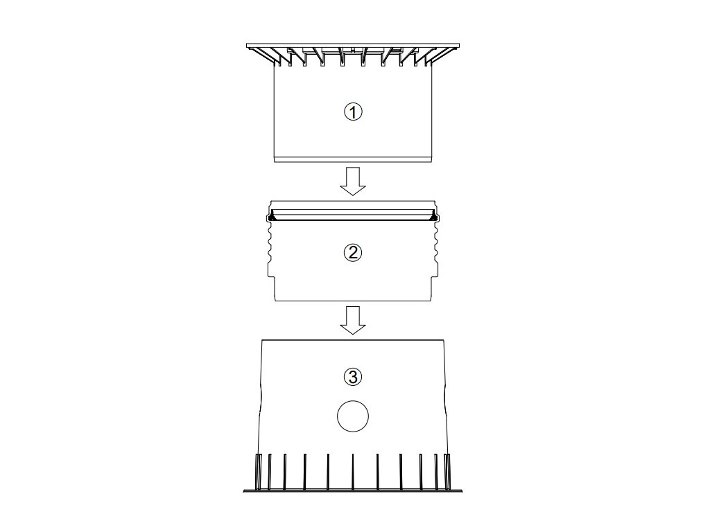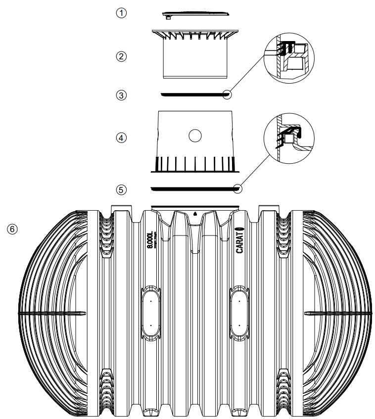 Je-li nádrž instalována pod pojezdovými plochami, pojížděnými nákladním vozy do 12 t, musí být teleskopický nástavec 1 (barva antracit) v oblasti límce podbetonována 4 (třída zatížení B25 = 250 Kg/m²). Následně se instalují betonové kruhy (Ø 600 mm) a litinový rám 5 s hvězdicovitým rozložením zatížení pro zabudování litinového víka (zohlednit min. 800 mm, max. 2000 mm půdního překryvu). Litinový rám musí mít styčnou plochu cca 1 m².