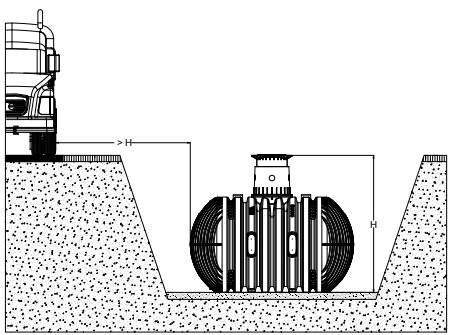 Jsou-li zemní nádrže instalovány vedle pojezdových ploch pojížděných těžkými vozy do 12 t, je třeba od těchto ploch dodržovat minimální odstup. Hloubka výkopu = vzdálenost od pojezdové plochy!