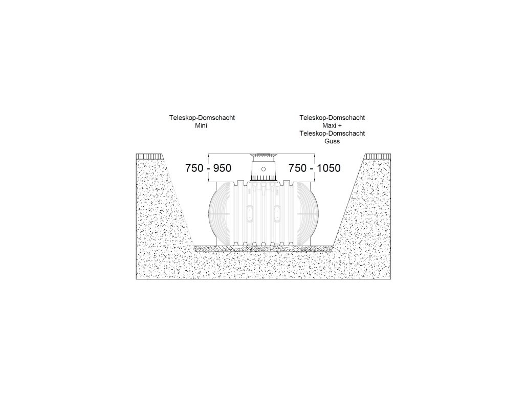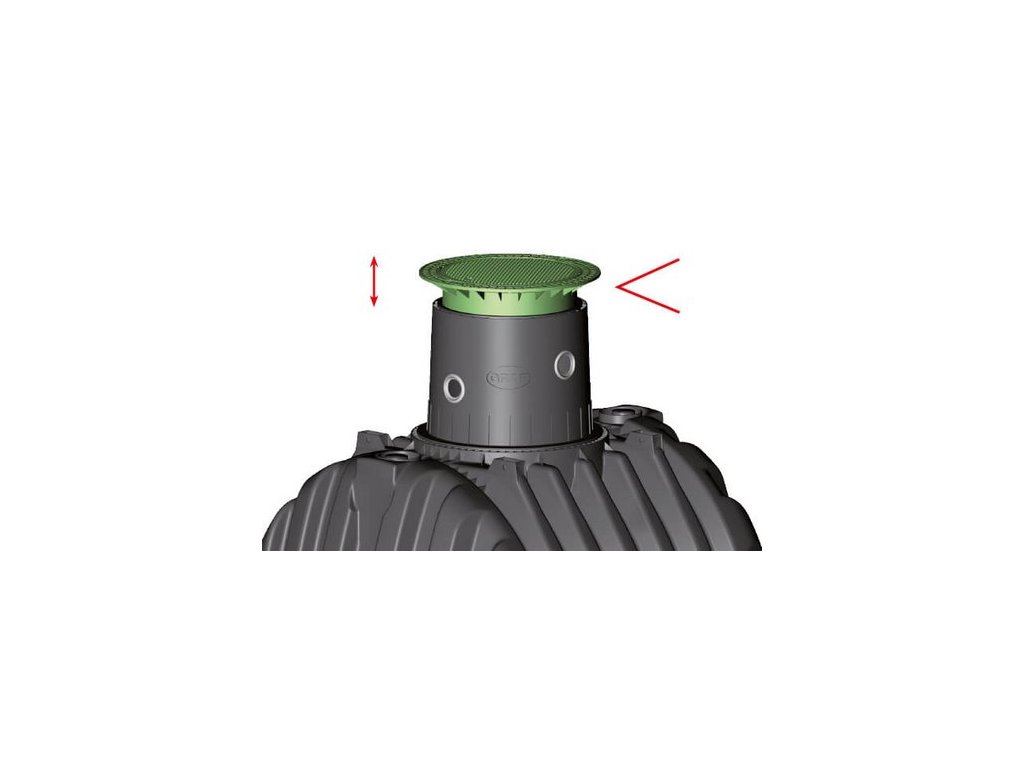 Pokud je pro větší hloubku krytí zapotřebí zvyšovací kus, vloží se do dómu nádrže pomocí mazadla. Profilové těsnění je zasunuto do nejvyšší drážky mezikusu a dostatečně namazáno. Potom zasuňte teleskopický nástavec a nastavte jej k povrchu terénu. Max. překrytí zeminou 2000 mm.