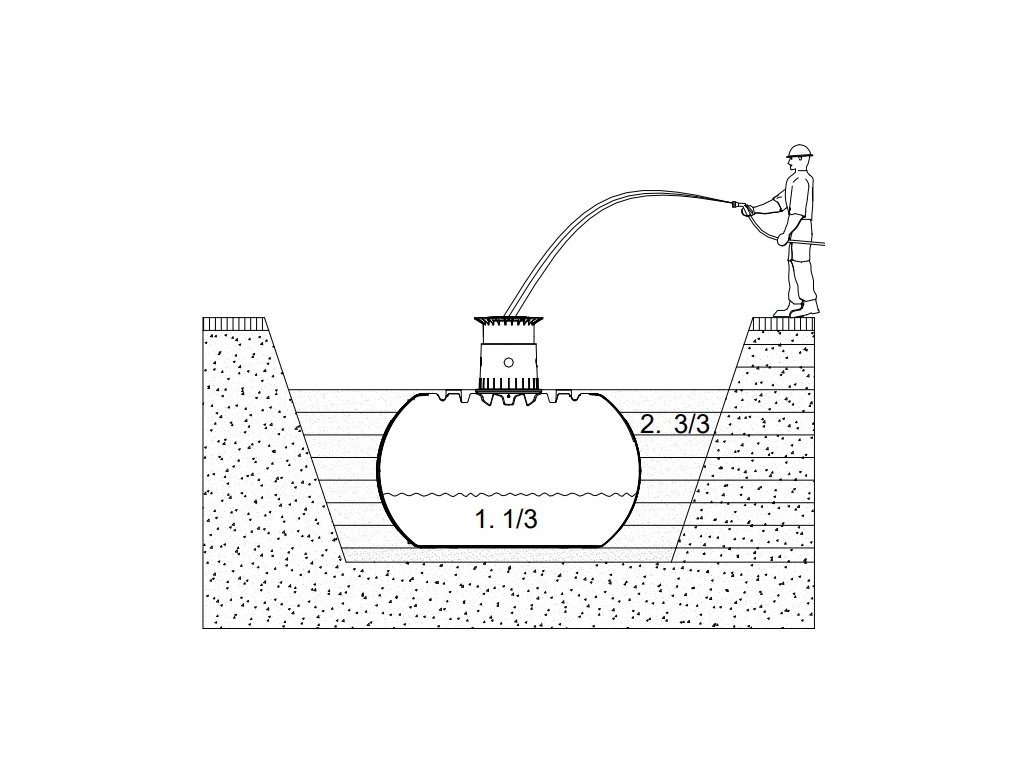 Pro zamezení případných deformací se nádrž před samotným obsypáním pláště naplní z 1/3 vodou, poté se ve vrstvách v max. 40 cm krocích obsype nádrž (kulatozrnný štěrk 8/16) až k hornímu okraji nádrže a vše se utěsní.