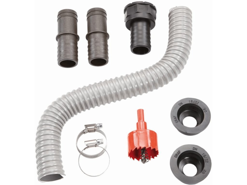 U sběrače PRO připojovací hadice není součástí, proto je třeba dokoupit zvlášť připojovací sadu - alternativou je použití trubky DN 50 (např. kanalizační) pro větší průtok.