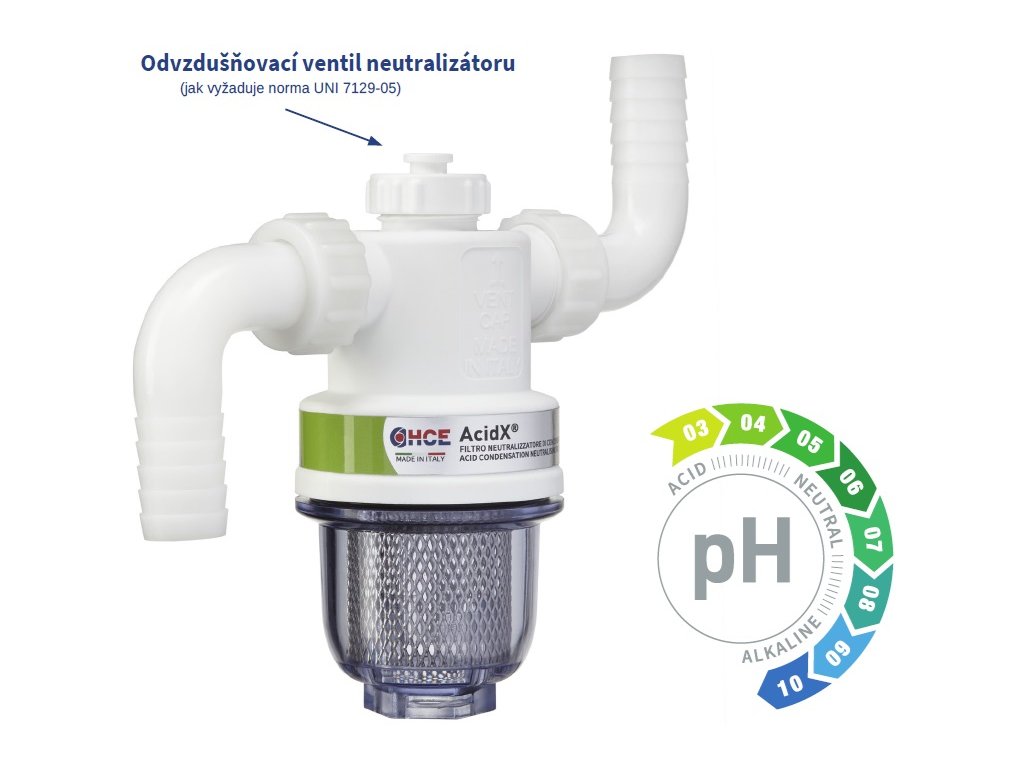Neutralizátor Acid X® Vent s pomocí neutralizační složky (uhličitan vápenatý CaCO3) zvyšuje pH vzniklého kondenzátu, a umožňuje tak jeho bezpečné vypouštění do odpadního systému.