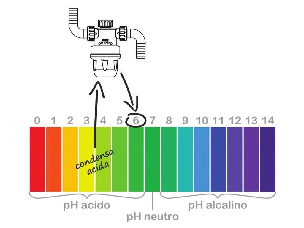 - při průtoku kondenzátu přes granulovaný uhličitan vápenatý se zvyšuje hodnota pH, dokud nedosáhne neutrální/zásadité hodnoty (pH>6), čímž se předejte korozi