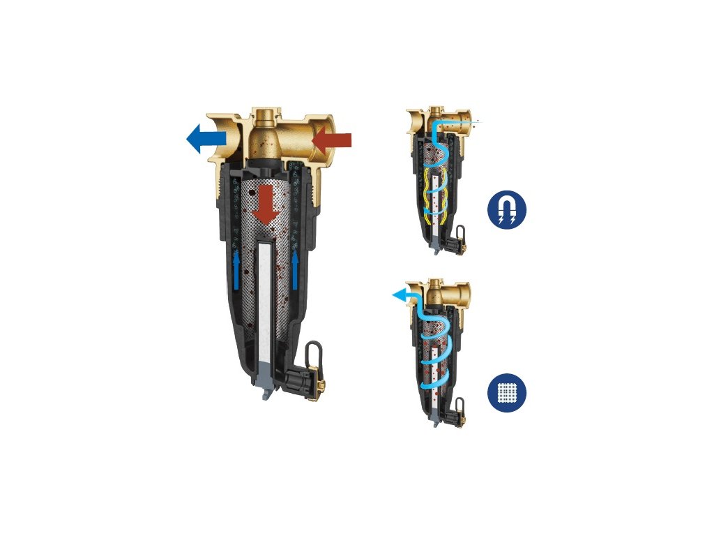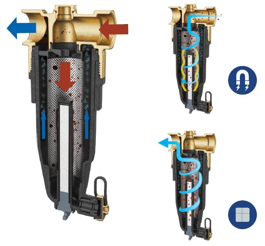 Náhlá změna průřezu (vstupní kanál má menší průměr než usazovací komora) zpomalí pohyb tekutiny a následně i rychlost unášených částic. Částice narážejí do pletiva filtračního síta a dále zpomalují svůj pohyb. Těžší částice jsou sráženy směrem dolů vlivem gravitační síly, která převažuje nad odporovou silou. Magnet uvnitř válce umístěného ve středu usazovací komory přitahuje všechny kovové nečistoty s magnetickými vlastnostmi. Tímto způsobem jsou odstraněny všechny magnetické (železné zbytky) a nemagnetické (sliz, písek, kal) nečistoty přítomné v systému.