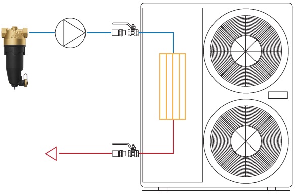 Doporučuje se nainstalovat DirtOUT® HP na vratný okruh na vstupu tepelného čerpadla, aby byl chráněn před všemi nečistotami přítomnými v systému, zejména ve fázi spouštění.