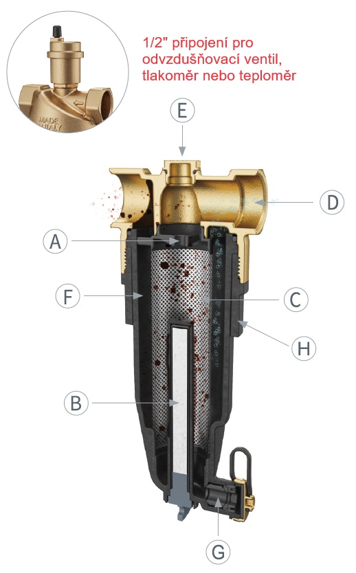 Tvar a materiály separátoru byly pečlivě vybrány, aby zajistily odpovídající výkon, odolnost a trvanlivost zařízení. Zařízení má vypouštěcí kohout a velkou sběrnou (sedimentační) komorou, která umožňuje snížit frekvenci vypouštění. Voda znečištěná nečistotami ze systému prochází v separátoru důležitou filtrační úpravou.