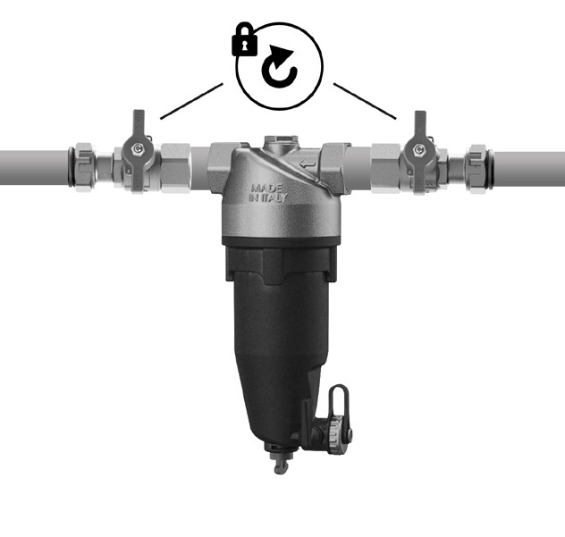 1. Uzavřete uzavírací ventil před a za odlučovačem nečistot