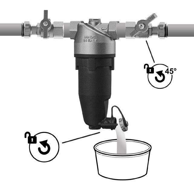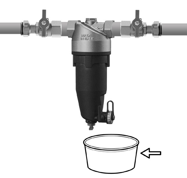 2. Otevřete vypouštěcí ventil, abyste odtlakovali systém a vyprázdněte vodu obsaženou ve filtru. Odpadní vodu zachyťte do sběrné nádoby o objemu minimálně 1 l