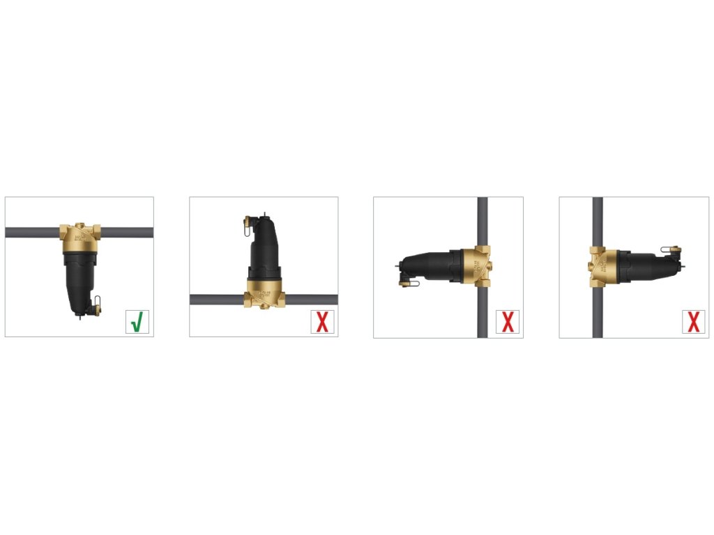Separátor nečistot by měl být přednostně instalován na vratné potrubí před tepelný zdroj. Vzduch nashromážděný v zařízení může být vyloučen ze systému namontováním automatického vypouštěcího ventilu na horní přípojku.