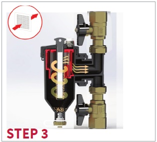 Přestože má zařízení velmi velkou sedimentační komoru, doporučujeme čištění při vypnutém zdroji a studeném systému, aby se cirkulaci topné kapaliny a návratu feromagnetických nečistot do oběhu po odstranění magnetu.