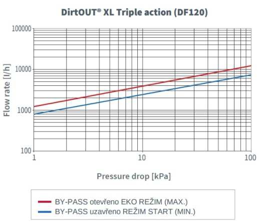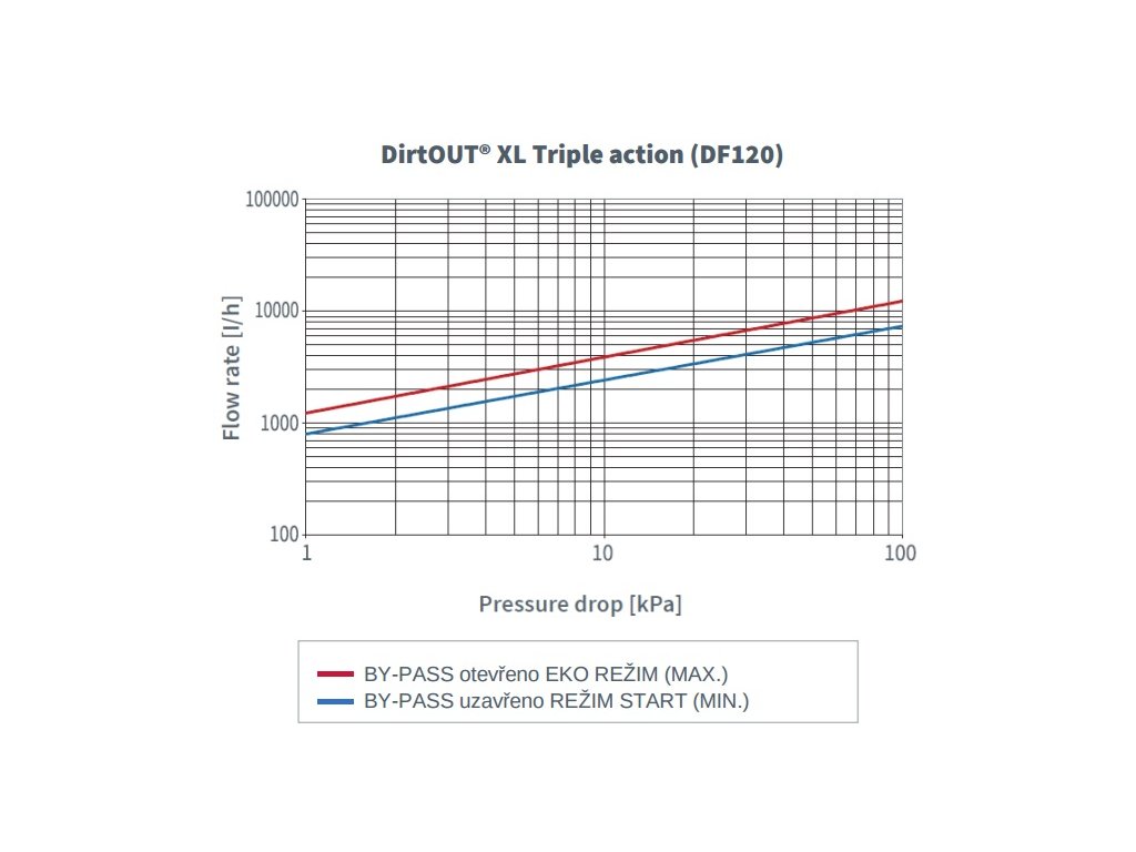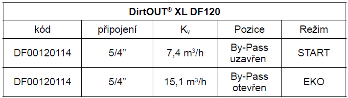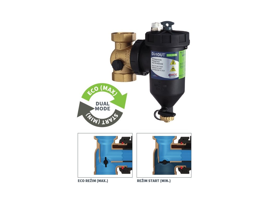 HCE DirtOUT XL® DUAL MODE DF120 (DF00110114 - 5/4") má obtok, který umožňuje snížit průtok procházející zařízením a tím zvýšit hodnotu Kv. Použití v režimu START se doporučuje posunutím voliče na MIN během uvádění SYSTÉMU do provozu a během prvních několika dnů používání systému. Za chodu přepněte do režimu ECO posunutím voliče do polohy MAX. REŽIM START (MIN) se používá hlavně při startu systému. V této poloze je veškerá voda systému přiváděna přes DirtOUT® XL. Výhodou je, že vzduch, mechanické a magnetické nečistoty se extrémně rychle separují. Tento režim umožňuje provést první velké čištění systému. ECO (MAX) REŽIM. V tomto režimu je část vody systému (částečný průtok) přiváděna přes DirtOUT® XL. Tato poloha zajišťuje nižší tlakovou ztrátu a pokles tlaku. Výhoda spočívá v tom, že čerpadlo systému musí méně pracovat. Vzduch, mechanické a magnetické nečistoty jsou zachyceny efektivně, ale se sníženou spotřebou.