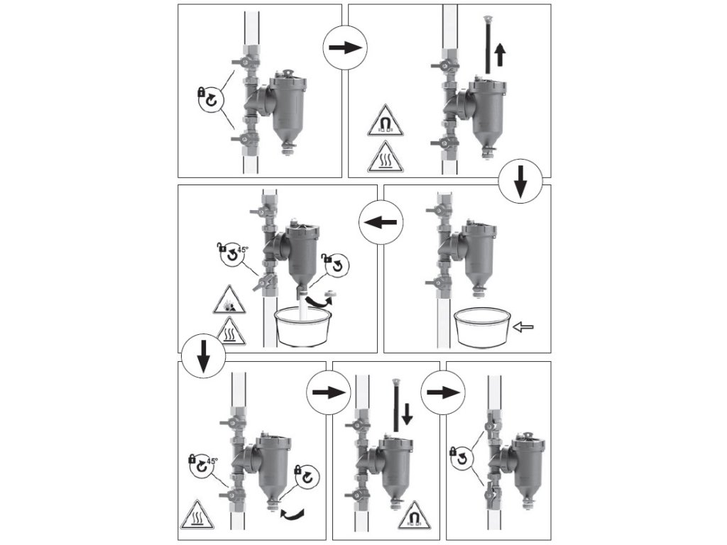 Přestože má zařízení velmi velkou sedimentační komoru, doporučujeme čištění při vypnutém zdroji a studeném systému, aby se cirkulaci topné kapaliny a návratu feromagnetických nečistot do oběhu po odstranění magnetu.
