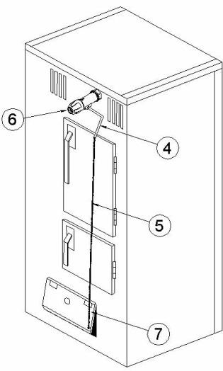 Ke kalibraci regulátoru tahu je potřeba nastavit správnou délku řetízku (5) mezi pákou (4) a odtahovými dvířky (7). Na regulátoru nastavte teplotu 60 °C. Podle potřeby otevírejte odtahová dvířka tak, aby teplota na kotli dosáhla požadovaných 60 °C. Když docílíte teploty 60 °C, pár minut vyčkejte. Až se teplota na kotli ustálí, upravte řetízek tak, aby byla odtahová dvířka otevřená cca 1 mm. Nyní je kotel připraven na regulaci teploty podle nastavení teploty na regulátoru.