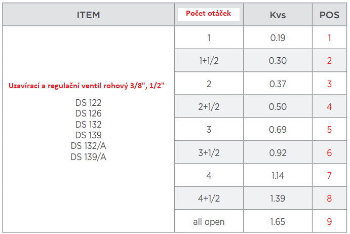 Nastavení průtoku ventilu. Odšroubujte plastovou krytku závitu ventilu. Pomocí šestihranného imbusového klíče 6 (nebo 10) nastavte požadovaný průtok. Otevřete (uzavřete) ventil o tolik otáček, kolik je uvedeno v tabulce níže. Po nastavení průtoku našroubujte plastovou krytku zpět na závit ventilu a bez použití nadměrné sily krytku dotáhněte.