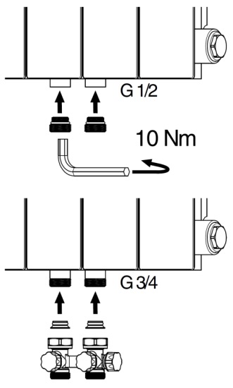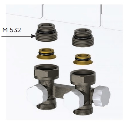 Pokud má radiátor spodní připojení G 1/2", použijte do radiátoru adaptér M 532 (není součástí balení) a utáhněte jej.