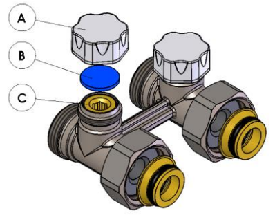 Nastavení průtoku ventilu. A Odšroubujte plastovou krytku závitu ventilu. C Pomocí šestihranného imbusového klíče 6 nastavte požadovaný průtok. Otevřete (uzavřete) ventil o potřebný počet otáček. B Po nastavení průtoku našroubujte plastovou krytku zpět na závit ventilu a bez použití nadměrné sily krytku dotáhněte.
